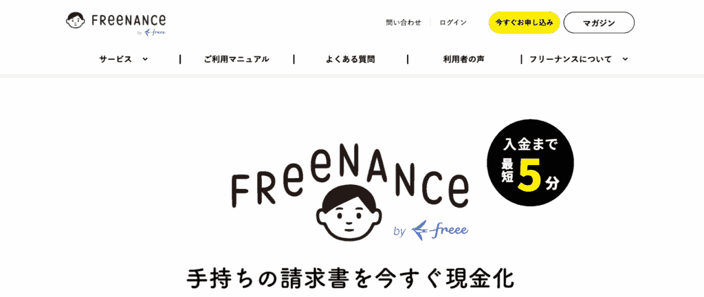 フリーナンスは、無料の損害賠償保険が付帯し、売掛金を最短即日で現金化できるフリーランス・個人事業主向けサービスです。