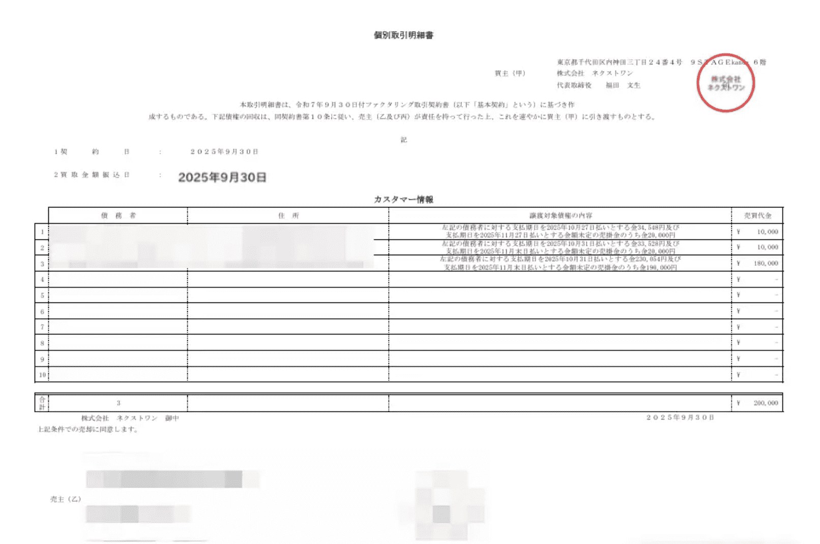 ネクストワンでは原則として債権譲渡登記が必要で、登記にかかる費用(登録免許税)は7,500〜15,000円程度が別途発生します。