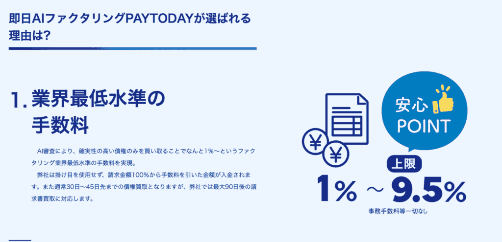 PayTodayは、手数料1〜9.5%と業界でも低水準で利用できるオンラインファクタリングです。